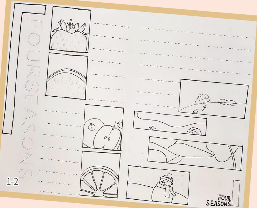 1 准备三张白色卡纸。第一张卡纸作为主页。在卡纸上用铅笔勾勒出线稿,左侧写上四季的英文FOURSEASONS,并用线框装饰。(剩余620字)