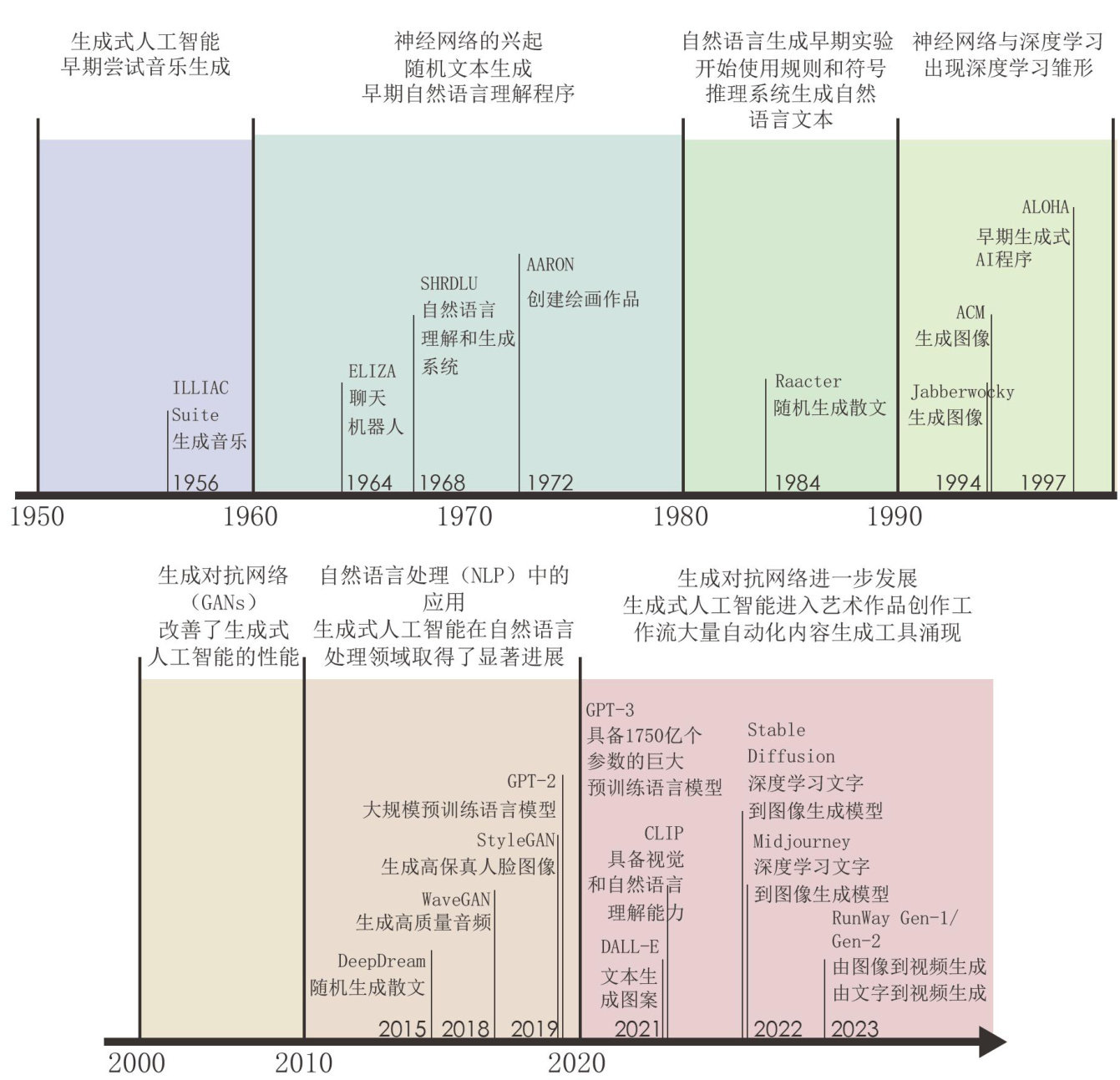 生成式人工智能(GenerativeArtificial In-telligence)是人工智能技术的一个分支,它的起源可以追溯到20世纪50年代。如图1所示,经历了从实验性到实用性的演进,随着神经网络概念的引入和进入新世纪后深度学习、生成对抗网络(GANs)、深度卷积生成对抗网络(DCGANs)以及变分自动编码器(VAEs)等技术的发展,生成式人工智能取得显著进展,能够生成逼真的图像、艺术作品、音乐等内容。(剩余6527字)