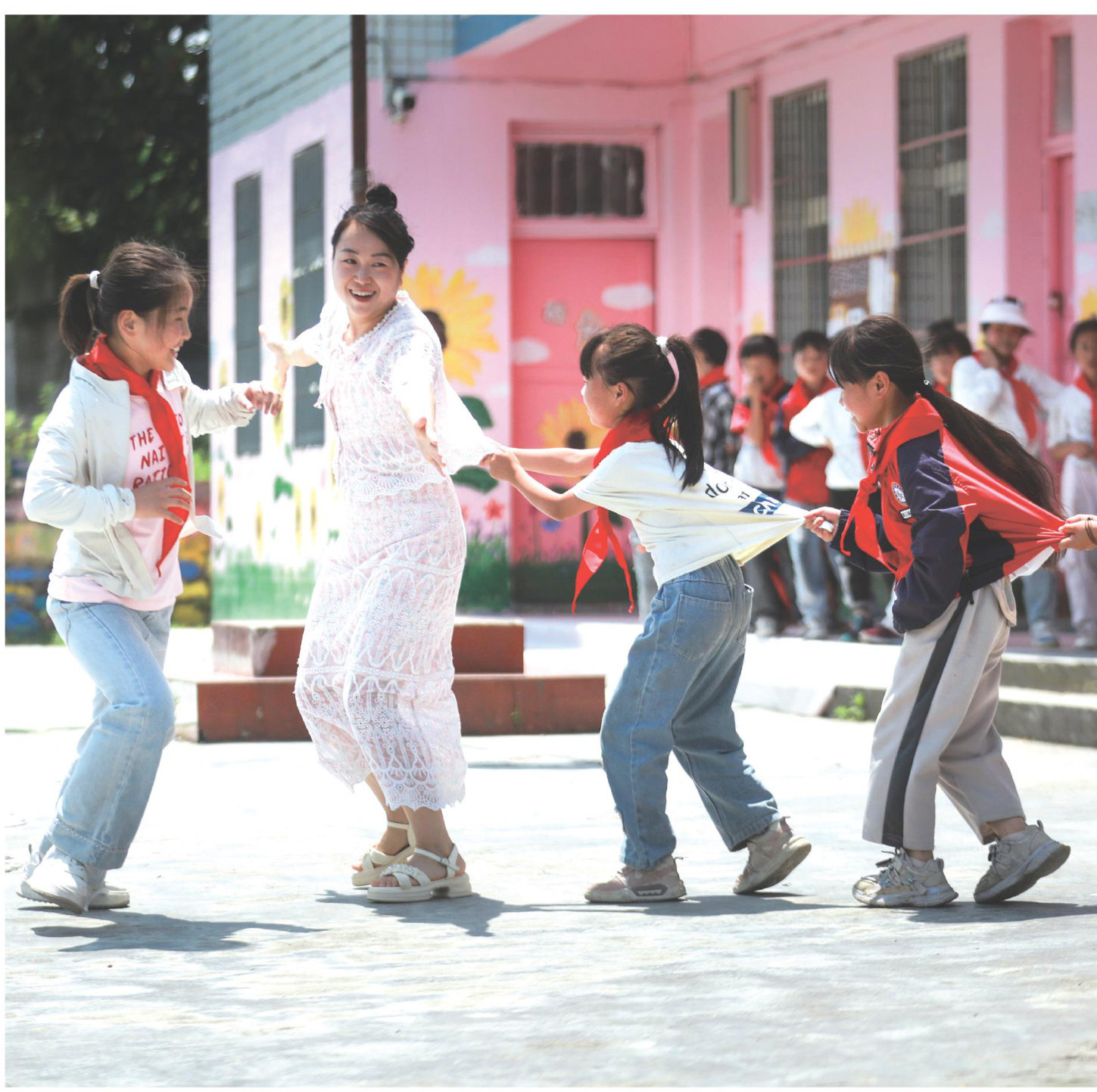 2025年7月8日,贵州黔西市五里布依族苗族乡箐头教学点,老师带领学生在课间玩老鹰捉小鸡游戏。(图/CFP)