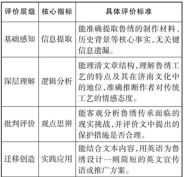 摘要:新中考改革背景下,山东省初中英语阅读命题转向素养立意,重点考查学生的逻辑推理、文化理解与知识迁移能力。当前阅读评价多停留在选择题刷题层面,难以真实反映学生的深度学习水平。本文结合2025年济南中考英语阅读真题《鲁绣的传承》,创新设计阅读思维层级量表、深度学习任务单及阅读成长档案袋三位一体评价工具,助力教师精准诊断学生阅读能力短板,推动阅读教学从浅层走向深度。(剩余2716字)