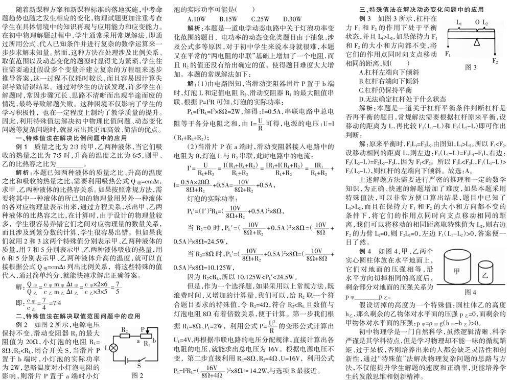 随着新课程方案和新课程标准的落地实施,中考命题趋势也随之发生相应的变化,物理试题更加注重考查学生在具体情境中的知识再现与应用能力和应变能力。在初中物理解题过程中,学生通常采用常规解法,即通过所用公式、代入已知条件并进行复杂的数学运算来一步步求解未知量。然而,这种方法在处理涉及比例关系、取值范围以及动态变化的题型时显得尤为繁琐,学生往往需要通过假设多个变量并建立复杂的方程组来逐步推导答案,这一过程不仅耗时较长,而且容易因计算失误导致错误结果。(剩余2437字)