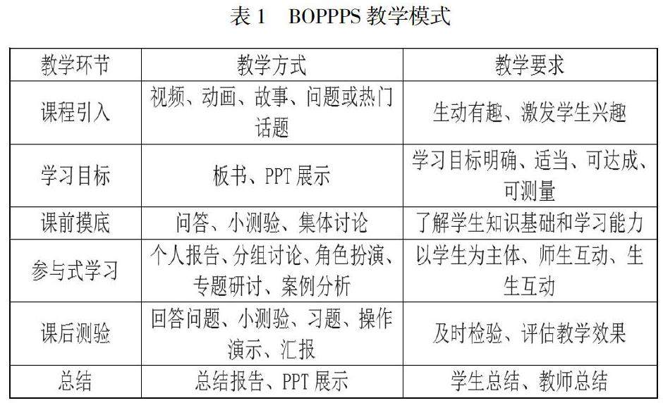 摘 要:BOPPPS模式是一种以学生为中心,以教学目标达成为手段,倡导学生参与和反馈的教学设计模式。本文基于市场营销学开展课程思政的现状,运用BOPPPS模式对市场营销学课程的教学目标、教学内容、教学手段进行设计,以此提高课程思政教学效果,为不同专业课程开展思政教育提供教学改革的思路。