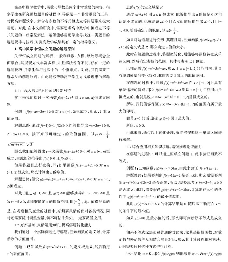 在高中数学教学中,函数与导数是两个非常重要的内容。很多学生在研究函数题目的过程中,导数是一个非常重要的工具,对提高解题效率、解含有参数的不等式恒成立等问题带来极大帮助。对此,在本文的研究中,需要思考高中数学中恒成立不等式问题的一些常见解法,希望能够帮助学生寻找这一类题目的解题规律与技巧,对提高数学成绩具有一定的指导意义。(剩余4188字)