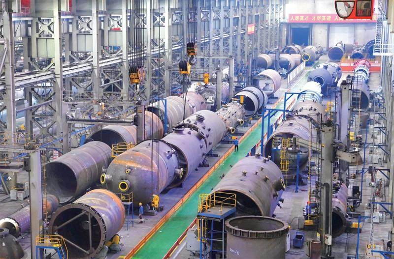 在潞安化机晋华炉生产车间内,一抹阳光从20多米高的厂房顶部斜射下来,投射在晋华炉上,工人师傅们正戴着氧焊面罩,争分夺秒地赶制着新的气化炉。