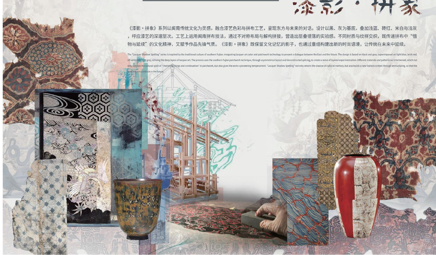 《漆影·拼象》系列的色彩灵感源自闽南传统漆艺,整体以黑与灰为基调,展现深邃与沉稳的文化底色。在此之上,叠加浅蓝、砖红、米白与浅灰等色彩,形成冷暖交错的视觉张力。色彩的碰撞不仅延续了漆艺层次丰富的质感,也赋予拼布结构以活力与变化,使传统色彩在先锋设计中焕发出新的生命力。(剩余1266字)