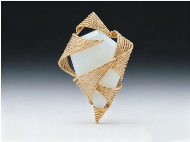 本款胸针以“心脏”为核心灵感来源,以抽象的几何切割与流动线条诠释“心心相印”的亲密关系。中间镶嵌的多边形白玉象征爱情的纯洁与坚韧,其通透质感透过花丝间隙折射出柔和光晕,恰似情感共鸣时的心跳共振,形成“怦然心动”的视觉隐喻,让珠宝成为爱情最纯粹的见证。(剩余75字)