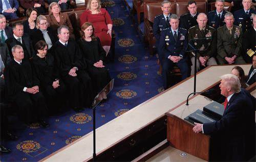 2026年2月24日,特朗普在美国国会大厦发表国情咨文,最高法院首席大法官约翰·罗伯茨、埃琳娜·卡根、布雷特·卡瓦诺和艾米·科尼·巴雷特出席(左侧前排)