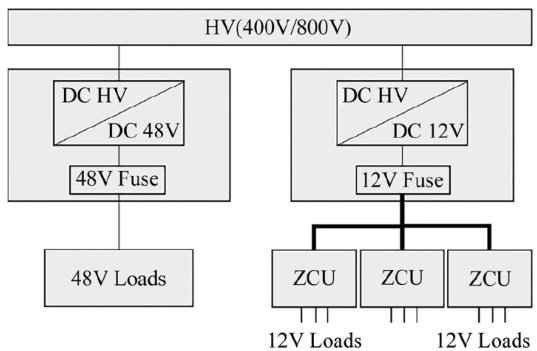 【Abstract】This paper summarizes the current electric distribution mode based on 12V in Electric Vehicle (EV) and Hybrid Electric Vehicle (HEV) Zonal architecture,and analyzes the advantages and disadvantages of the 12V system. Then,theevolutionofdistributionmodeof48VbasedpowersysteminZonalarchitecture isanalyzed,includingtheaspects of DC-DC conversion eficiencyandcost,eFuse andharnessusearecomprehensivelyanalyzed,andtheadvantagesof 48V system and the challenges faced by future applications are summarized.