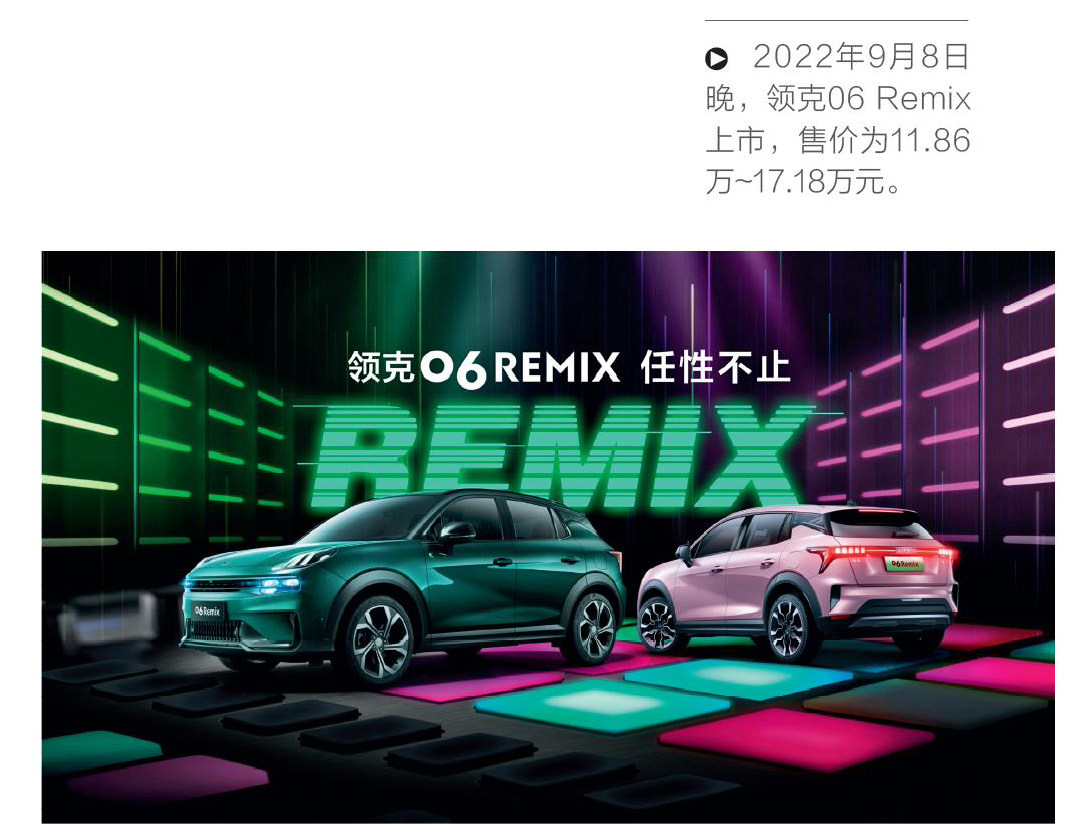 两岁生日之际,领克06再添新丁:2022年9月8日晚,北京金隅智造工场热闹非凡,领克06 Remix新英雄之夜上市两周年派对暨新车发布会在此盛大举行。此次领克06 Remix共推出9款车型,售价为11.86万-17.18万元,新车为用户提供燃油、插电混动2种动力选择。(剩余1792字)