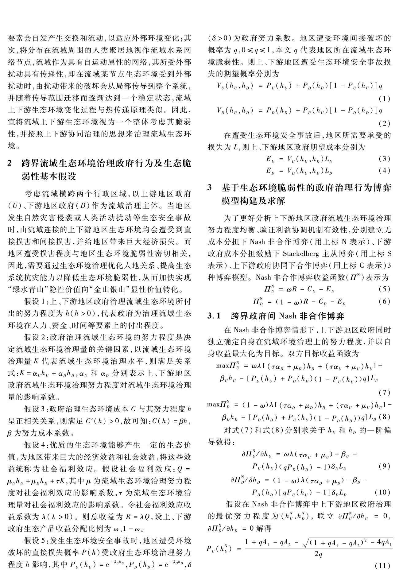 针对跨界流域生态环境协同治理面临的横向治理评估体系不完善、治理主体主动施策意愿低的问题,从流域生态环境脆弱性改善、生态价值实现角度探索治理主体协同决策的动力机制。分别构建Nash非合作博弈、Stackelberg主从博弈以及协同合作博弈模型,分析流域上下游政府的生态环境协同治理策略,并建立基于流域生态环境脆弱性变化的横向生态补偿机制。(剩余12179字)