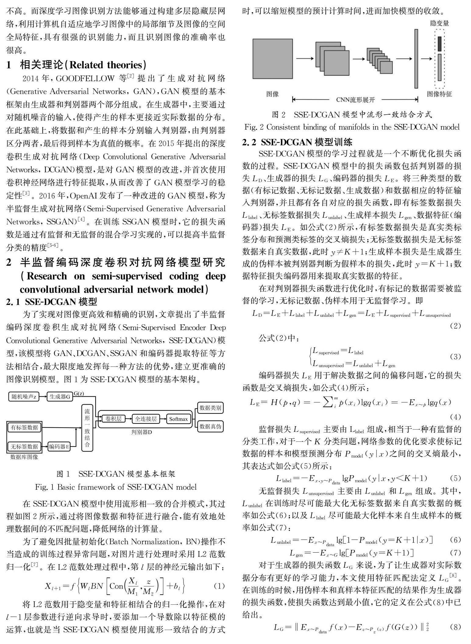 摘 要:生成对抗网络因为在训练时具有能快速获取真实感、产生大量特征等优点,所以该方法在有监督和半监督的图像识别中逐渐得到广泛应用。文章以提高GAN(Generative Adversarial Networks)模型下的图像识别准确率为目标,基于已有的GAN模型,提出一种基于GAN模型的半监督深度学习模型,并将所建模型放入MNIST、CIFAR-10和Fashion-MNIST三种不同的数据集进行测试,结果显示,SSE-DCGAN模型在三种数据集标签数据较少时,能够很好地识别图像,在三个数据集上识别精度分别达到99.04%、83.66%、89.64%,进行消融实验的结果也表明,在模型中加入编码器后,准确率分别达到0.43%、2.55%、4.44%的提升。(剩余5306字)