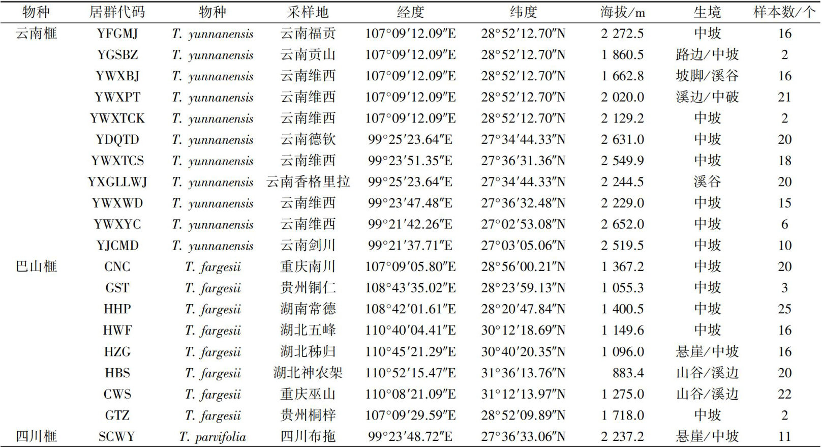 AbstractTo unveil the genetic diversity and structure of Toreya plants and lay a theoretical foundation for evaluating,protecting and utilizing germplasm resources,a total of 295 samples from 4 Torreya species were used as materials.After selection,15 pairs of selected primers were employed for SSR-PCR amplification across all samples,and the amplification products were analyzed by capillry electrophores detection to explore their genetic diversity and structure,and cluster analysis was conducted. The results revealed the folowing insights:(1) Based on the effective alele,the genetic diversity from high to low was Torreya fargesii ( P= (204号 87.50% , He=0.396 , I=0.740 ),Torreya taxifolia ( P=86.67% , He=0.342 , I=0.596 ),Torreya parvifolia ( P=73.33% , He=0.285 , I=0.480 ),and Torreya yunnanensis ( P=57.57% , He=0.194 , I=0.332 ). (2) The average Fis value of 21 Torreya populations was O.174, the average Fst value was 0.490,and the Nm was 0.260, indicating that gene exchange occurred infrequently. The Fit value of Torreya populations was greater than the Fis value,suggesting that the heterozygous level between populations was higher than that within populations.(3)The results ofthe analysis of molecular variance indicated that the genetic variation of Torreya plants mainly originated among populations with a variable coefficient of 58% . The Nei's standard genetic distance among 21 populations ranged from 0.018 to 2.453 with an average of 0.609. Overall,the genetic distance was positively correlated with the geographical distance ( r=0.759 , P<0.05 ),while there was no significant correlation between the genetic distance and geographical distance in T. yunnanensis and T. fargesii. (4) Genetic similarity coeffcients among the21 populations were ranged from 0.403 to O.983.Using a threshold of 0.12,the populations were grouped into 2 major categories with T. taxifolia forming one category and the remaining 2O populations of the other three species another.At a threshold of O.58,they could be divided into 4 major categories.
