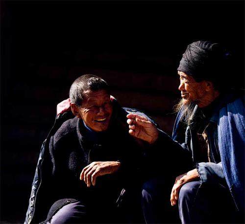 2024年10月29日,在凉山州金阳县,阿的鲁满(86岁)与吉伙什清(62岁)边晒太阳边聊着天。杨凯生 摄