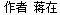 蒋在,北京老舍文学院合同制作家。小说发表于《人民文学》《十月》《当代》等刊。出版小说《外面天气怎么样》《街区那头》《飞往温哥华》,诗集《又一个春天》。曾获山花文学双年奖新人奖、钟山之星文学奖、西湖新锐文学奖、储吉旺文学奖、草堂诗歌奖等。牛津大学罗德学者提名。首师大外国语言学及应用语言学在读博士。