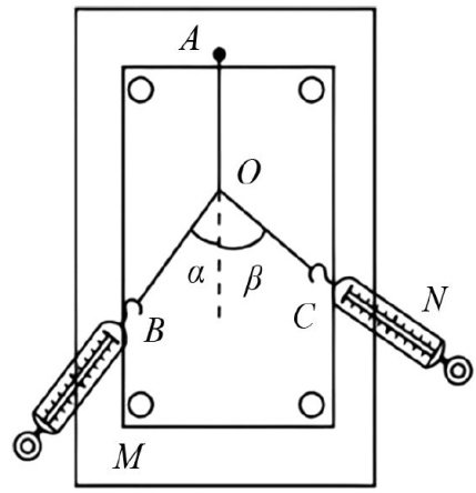 例1一实验小组做“验证力的平行四边形定则”实验时,其装置如图1所示,图中 A 是固定橡皮条用的图钉, O 是橡皮条和细绳相连接的点,OB以及 OC 是两根细绳.在实验进行过程中,某次测量时,两个弹簧测力计 M 和 N 的拉力方向相互垂直,满足 α+β=90∘ 的条件.若保持弹簧测力计 M 的示数不发生改变,当角度 α 从图示位置慢慢减小时,为保证橡皮条与细绳的连接点依旧处在 O 点,能够采取的措施是( )