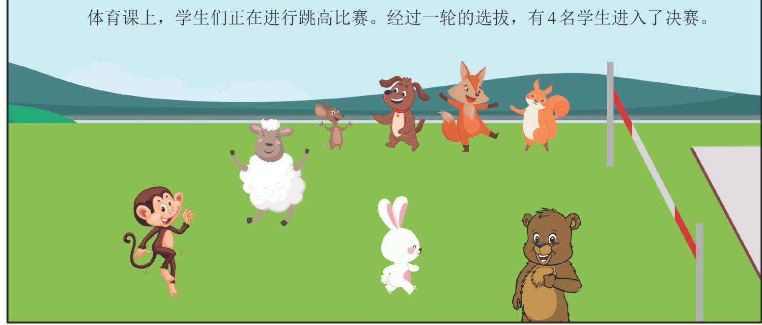 决赛开始了。第一个跳高的是小羊青青。他先试跳的高度是12分米。只见青青奋力跃起,轻松跳过了标杆,稳稳地落在了垫子上。他又试跳了几个高度,最高成绩是15.1分米。