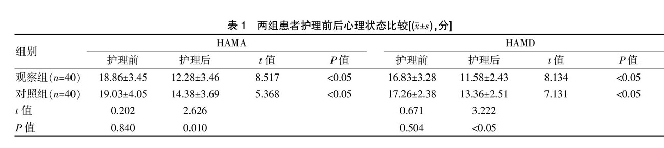 [摘要] 目的 探讨系统性护理干预对2型糖尿病肥胖患者焦虑抑郁不良情绪的临床效果。方法 选取东营市中医院精神卫生康复科2019年1月—2021年1月收治的80例2型糖尿病肥胖患者作为该次的研究对象,并按照随机数表法将其分为对照组和观察组,每组40例。对照组给予常规护理,观察组给予系统性护理,利用汉密斯顿焦虑量表(HAMA)和抑郁量表(HAMD)对两组患者护理前后的心理状态进行评估。(剩余7841字)