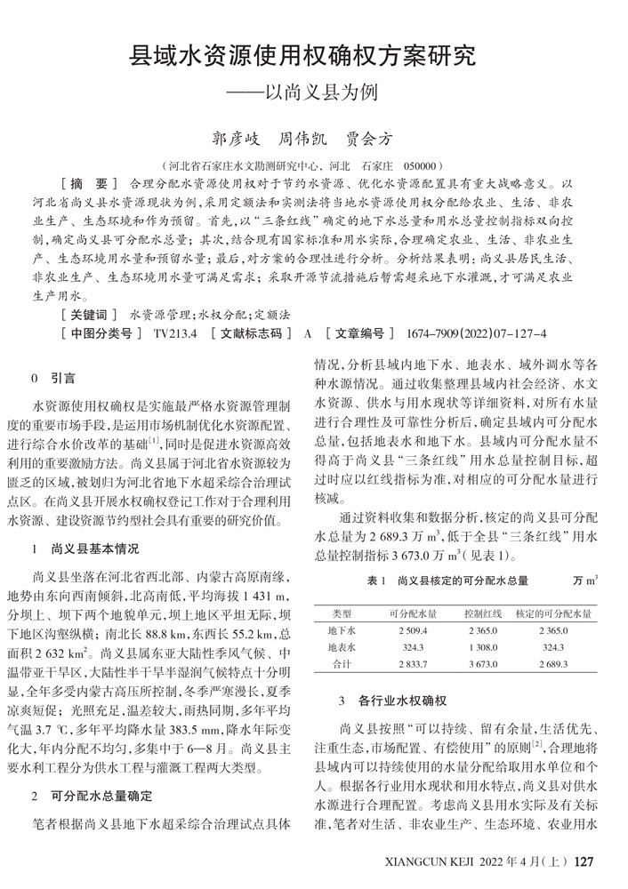 [摘 要] 合理分配水资源使用权对于节约水资源、优化水资源配置具有重大战略意义。以河北省尚义县水资源现状为例,采用定额法和实测法将当地水资源使用权分配给农业、生活、非农业生产、生态环境和作为预留。首先,以“三条红线”确定的地下水总量和用水总量控制指标双向控制,确定尚义县可分配水总量;其次,结合现有国家标准和用水实际,合理确定农业、生活、非农业生产、生态环境用水量和预留水量;最后,对方案的合理性进行分析。(剩余5194字)
