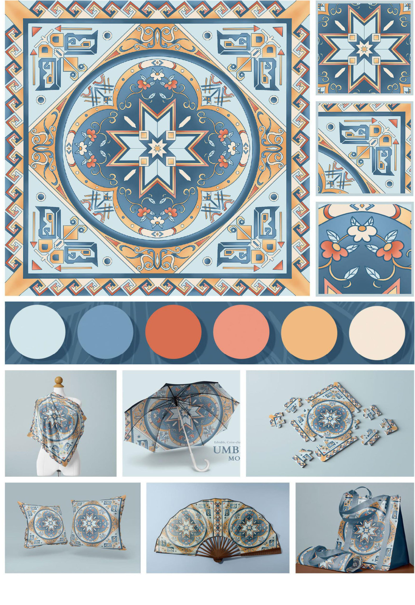 设计说明:本系列设计作品以“传承与创新”为核心理念,在保留瑶族传统纹样精髓的基础上,运用现代设计手法进行创新,使设计具有民族特色,符合现代审美。图案采用了瑶族传统八角花形纹、万字纹、菱形鱼纹等经典元素,通过重组排列生成新纹样,色彩以黄蓝为主调,搭配暖橙、浅粉等色调强化视觉张力,整体既留存民族文化内核,又适配现代审美偏好。(剩余211字)