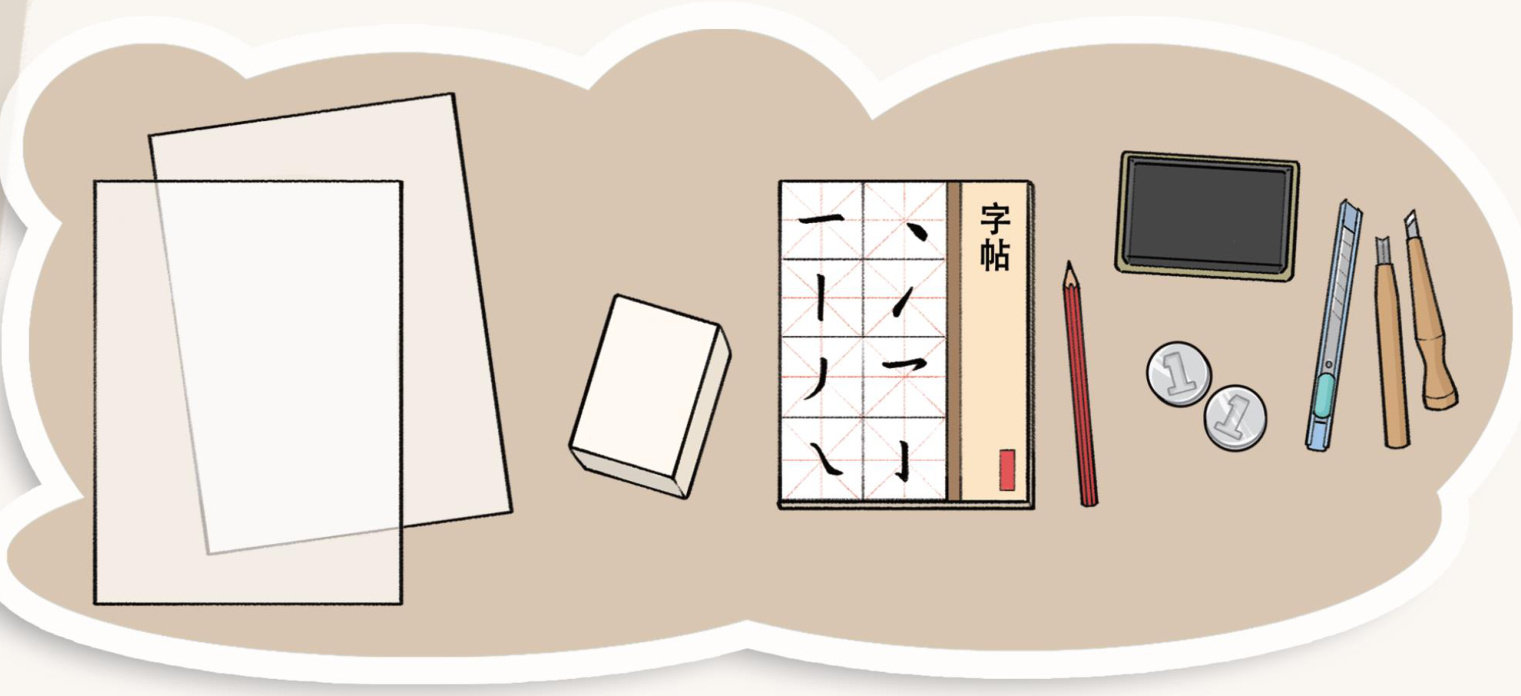 你需要准备:硫酸纸、大块橡皮、字帖、铅笔、黑色印台、硬币、美工刀、刻刀。(剩余0字)