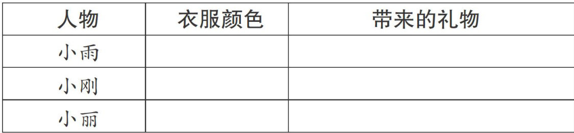 新年期间,小明家举办了一场马年主题聚会,邀请了小雨、小刚、小丽三位同学来做客。他们每个人都带来了一份马年相关的礼物,分别是马形玩偶、马年邮票、“马到成功"字画,并且每个人都穿着不同颜色的衣服,分别是红色、黄色、蓝色。请根据下面的线索,推理出每个人穿的衣服颜色和带来的礼物,并将推理结果写在下面的表格中。(剩余115字)