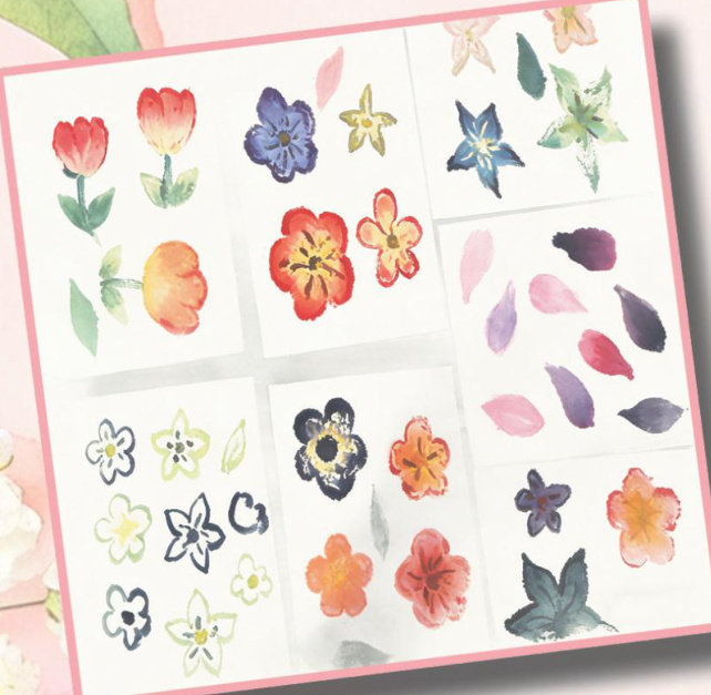 如图,用水彩颜料在空白画纸上画出形态各异、色彩缤纷的花朵和叶子图案。用剪刀将画好的花朵、叶子图案剪下来
