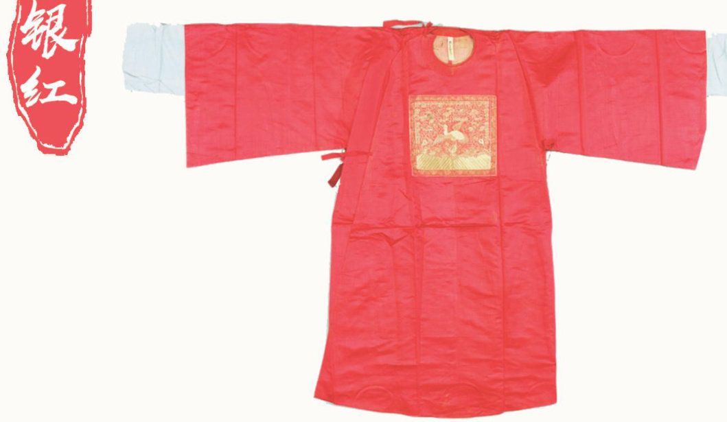 银红色素缎缀平金绣云鹤纹方补男官衣