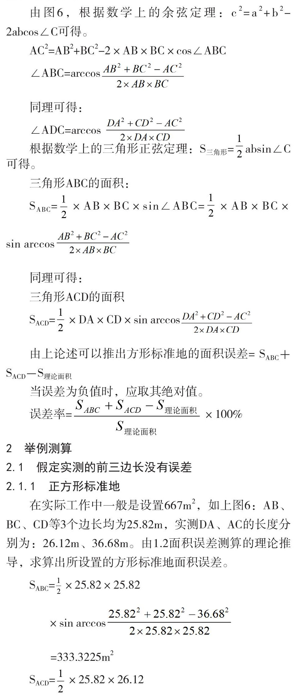 摘要:将实地调查所设置的方形标准地由其对角线分割为2个三角形,量取其4个边和分割线的长度,由数学上的余弦定理和正弦定理求算出2个三角形的面积,然后求和与其理论面积对比,从而计算出方形标准地面积误差。