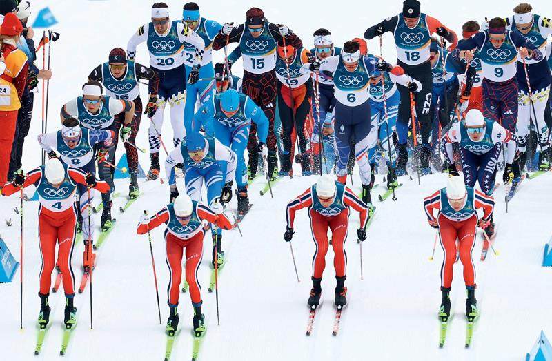 男子越野滑雪50公里集体出发决赛,各国选手起跑瞬间。