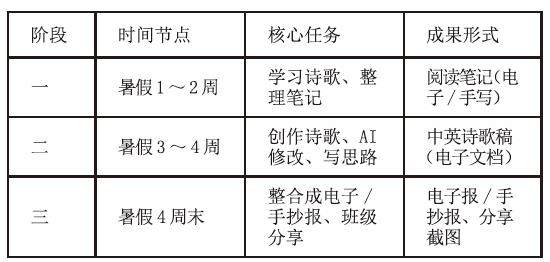 【摘要】在新时代教育改革与AI技术发展的双重背景下,针对中学英语教学中实践场景不足、学科融合薄弱、核心素养培育路径单一的现实困境,本文提出“AI赋能的英语跨学科诗意劳作”暑假作业设计方案。该方案以英语学科为核心载体,整合语文、信息技术、劳动教育学科资源,构建“英语语言—实践应用—技术赋能”三位一体的学习生态。(剩余3660字)