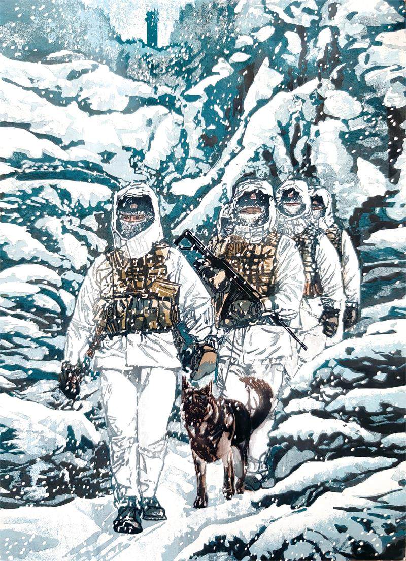 这幅《东方第一哨》呈现的是黑龙江边境哨所官兵在严寒中巡逻的场景,为水印木刻版画,是我深入黑龙江边境地区、实地体验生活后创作的作品。(剩余463字)