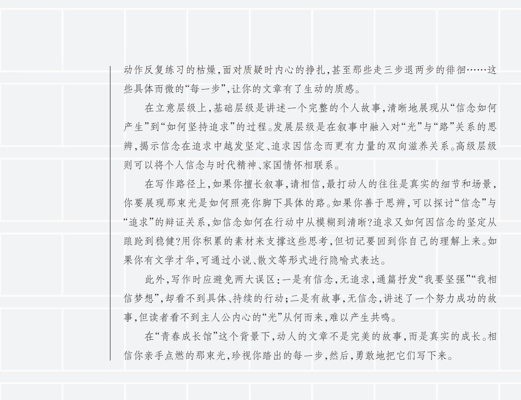 学校的“青春成长馆”正在筹备“信念与追求的力量”主题展览,现面向全校同学征集稿件。展览前言写道:“信念,是黑暗中我们自己点燃的那束光;追求,则是凭借这束光向前踏出的每一步。它或许微弱,却足以照亮脚下的路,赋予我们持续前行的勇气。”