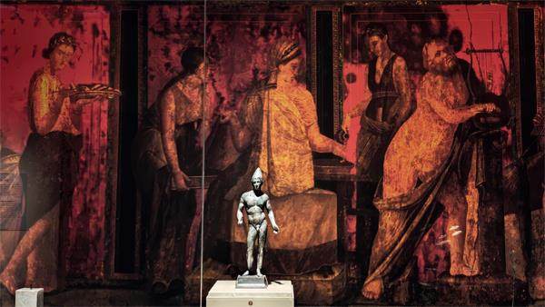 青铜小雕像陈列在复制的庞贝室内壁画前。本文摄影/本刊记者 倪伟