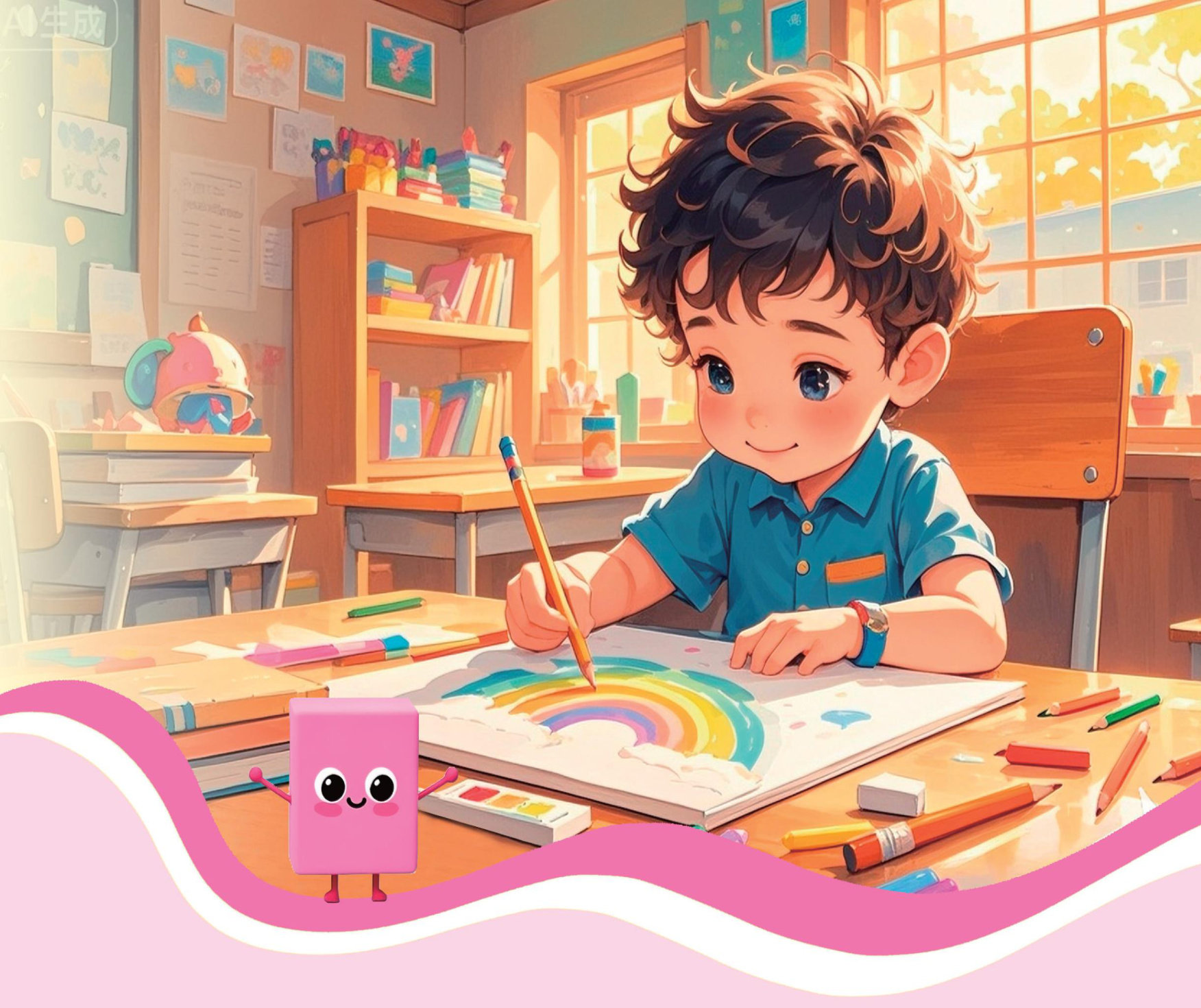 数学课上,小主人写竖式时,把8写成了3。他急忙拿起我,在纸上轻轻一擦,错误的笔迹就像被施了魔法似的消失了。我身上沾了点儿黑铅,却开心极了,因为我帮助了小主人呀。