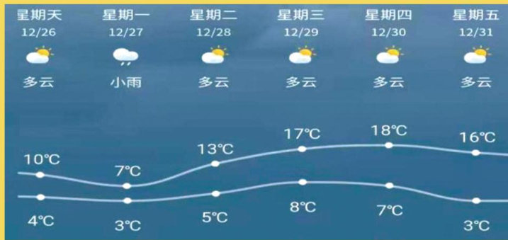 同学首先发言:“我看到了五行信息:从上往下数,第一行是星期,从星期天到星期五;第二行是日期,从12月26日到12月31日;第三行是天气情况,除了星期一有小雨,其余五天都是多云;第四行是每天的最高气温;第五行是每天的最低气温。(剩余437字)
