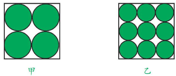 题目: 有甲、乙两块面积一样的正方形铝板,王师傅现在要将甲板裁出4个同样大小的圆铝板,将乙板裁出9个同样大小的圆铝板,问两块铝板剩余的边角料总面积哪个更大。