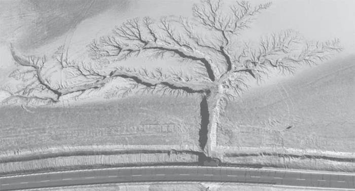 在西藏一条道路旁,雨水侵蚀形成的沟壑形成了树一般的图形。摄影师栗平用无人机拍到这一令人惊叹的景象。(剩余24字)