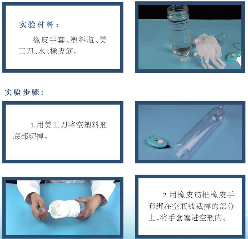 塑料瓶里充满了空气,将瓶子浸入水中,水把瓶内的空气“挤”进了橡胶手套,使手套像充了气的气球一样鼓了起来。(剩余34字)