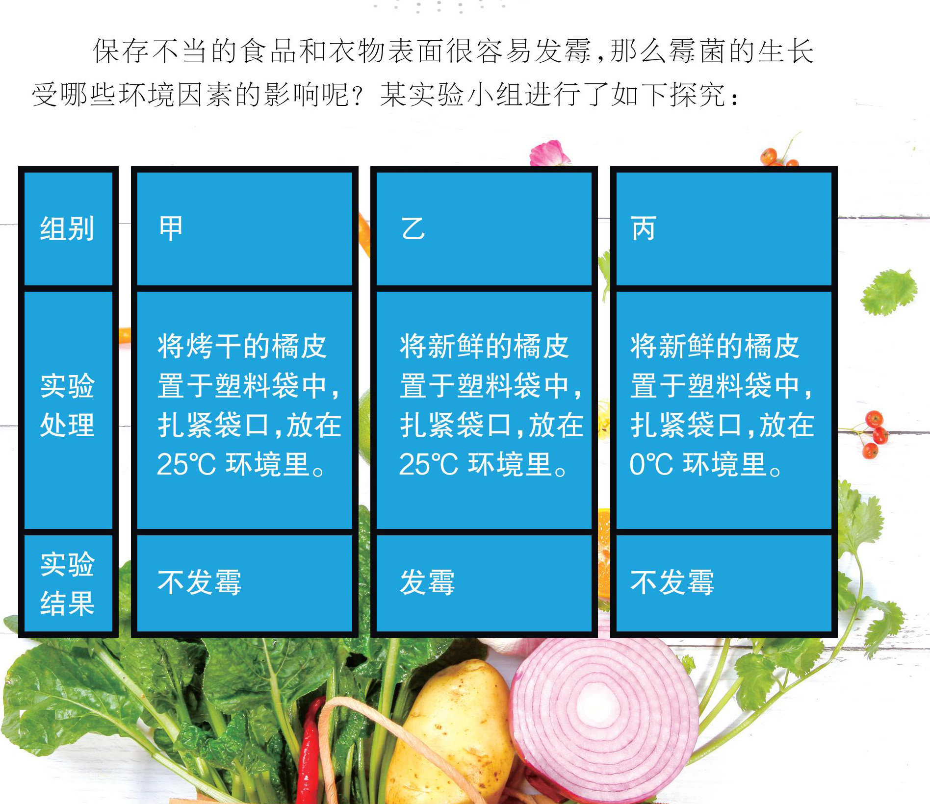 保存不当的食品和衣物表面很容易发霉,那么霉菌的生长受哪些环境因素的影响呢?某实验小组进行了如下探究:
