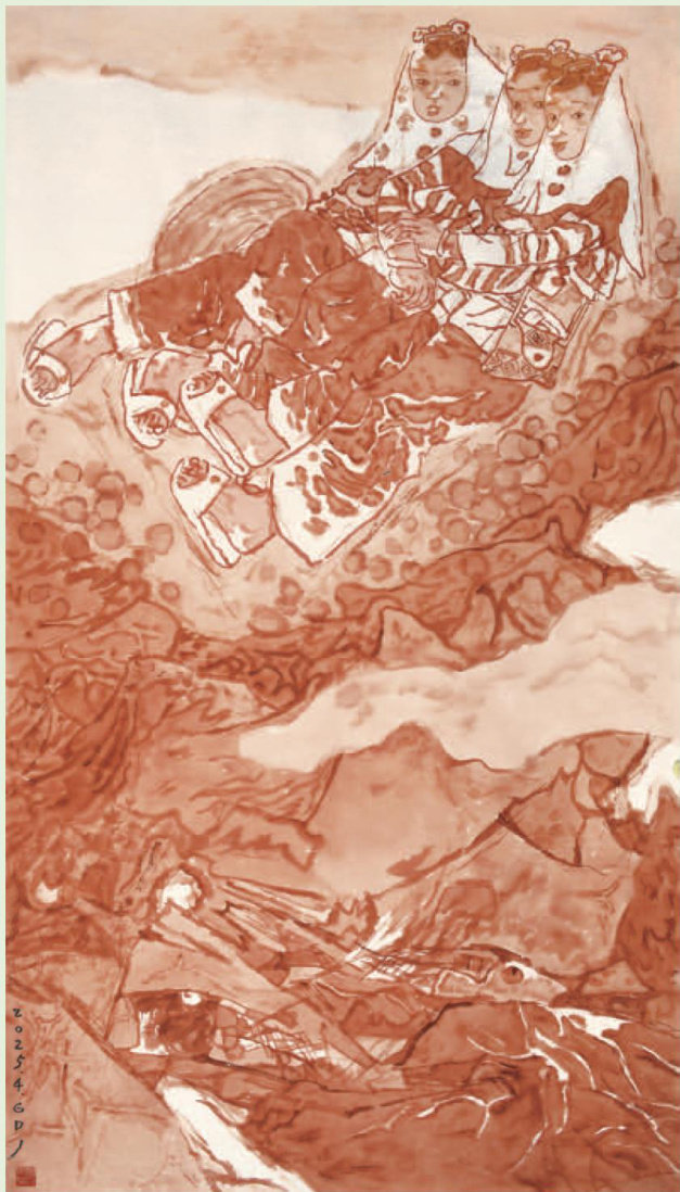画家郭东健的惠安女母题绘画风格衍变从2009年至今经历了三个阶段:从早期参考照片的具象水墨创作,到中期文化考古与民间艺术的滋养造就了意象参半的变,再到近年了然于心的纯主观化的胸中意象抒发。这一过程恰与王国维《人间词话》中人生三境界形成呼应一一其初期创作既合晏殊“昨夜西风凋碧树,独上高楼,望尽天涯路”的艺术探源之志,亦历经柳永“衣带渐宽终不悔,为伊消得人憔悴”这般敬终慎始的追求,近年来渐达辛弃疾“众里寻他干百度,蓦然回首,那人却在灯火阑珊处”的自性澄明之境。(剩余3975字)