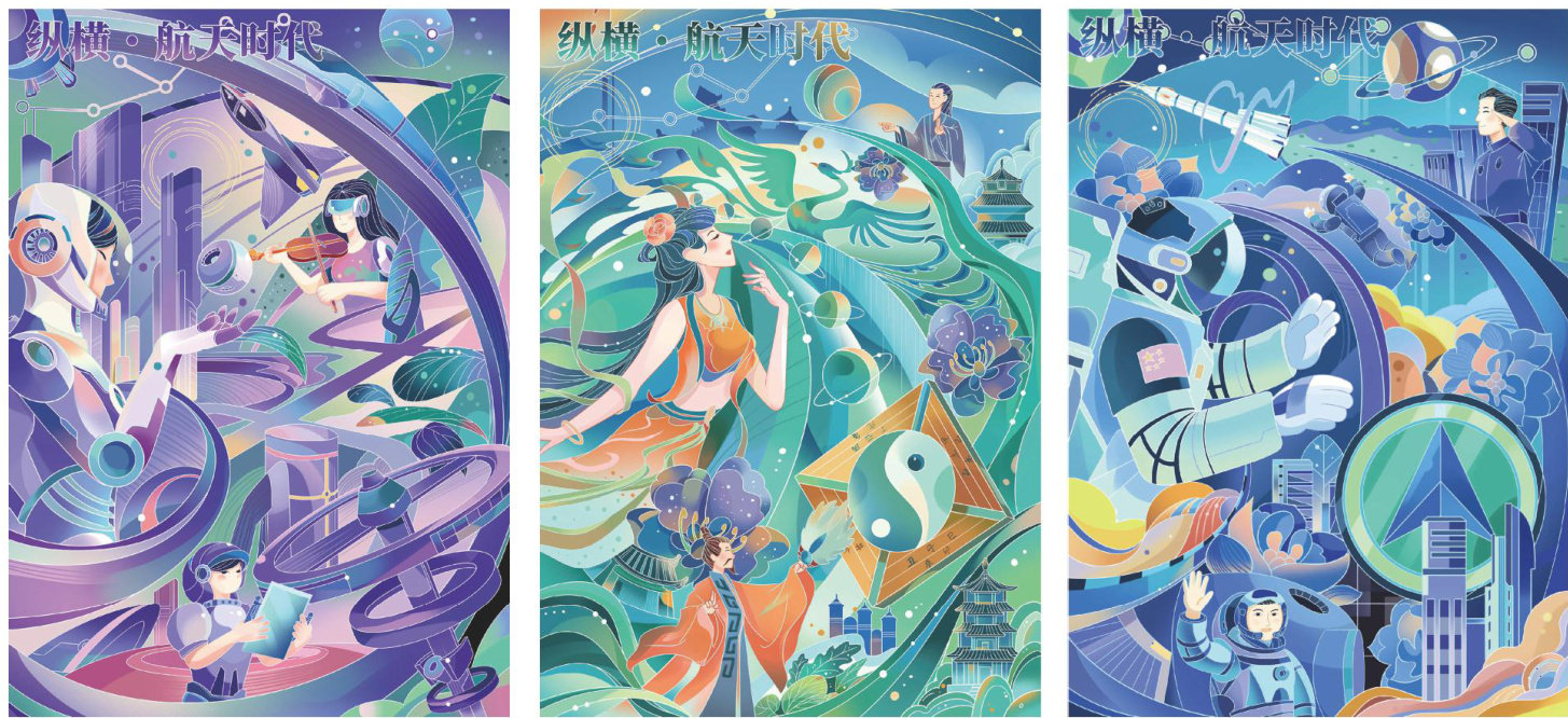 作品绘画出了中国航天科技的壮丽历程,三幅插画串联过去、现在与未来。(剩余237字)