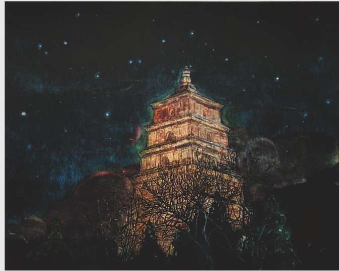 《白夜·雁塔》纸本综合材料版画