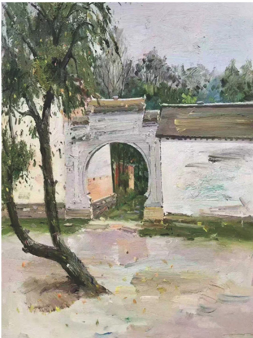 作品介绍:这是一幅充满写意气息的风景油画,描绘了江南徽派风格的民居院落一角;以柔和的灰白为主色调,搭配绿树的鲜嫩绿意与门内隐约的暖橙色墙面,营造出温润、静谧的氛围,贴合南方阴湿天气下的视觉感受。细腻而松弛的笔触,既保留了白墙灰瓦的质感,又通过树影的斑驳、地面的肌理,传递出岁月沉淀的慵懒与安宁。半开的拱门引导视线向内延伸,留白的墙面与倾斜的树木形成动静对比,仿佛在诉说老院的过往。(剩余0字)