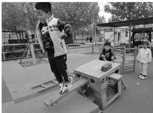 幼儿们对户外自主搭建充满兴趣。起初,他们只是将梯子、木板、九宫格自由组合,开展攀爬游戏。