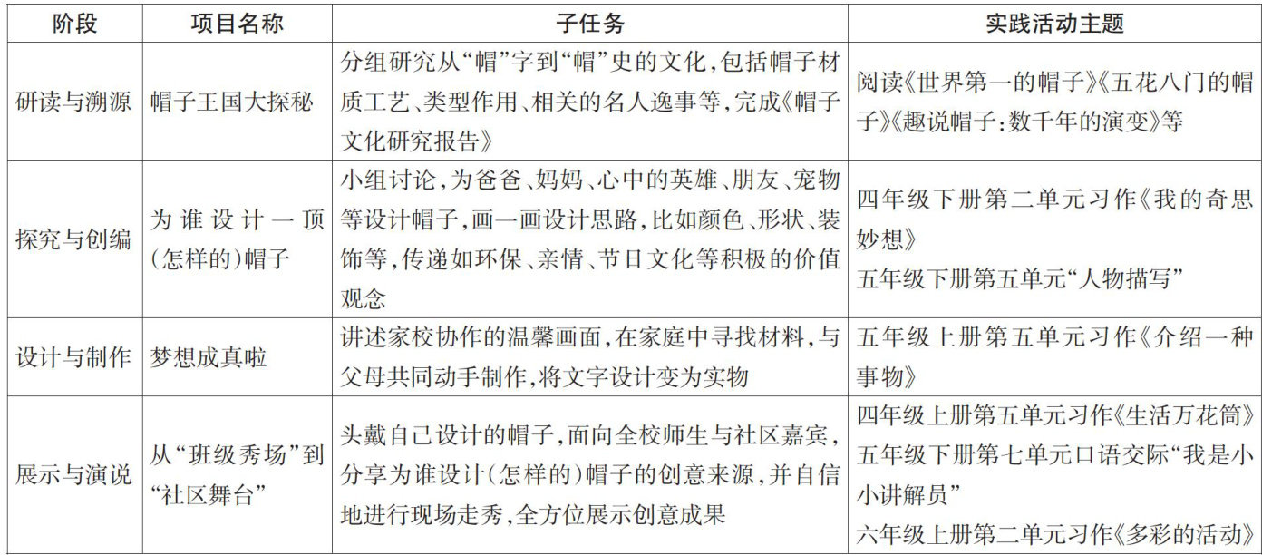 《义务教育课程方案(2022 年版)》指出,“突出学科思想方法和探究方式的学习,加强知行合一、学思结合,倡导‘做中学’‘用中学’‘创中学’”[1] 。突破传统课堂的边界,引导学生在真实问题的解决中融通语文知识与能力,既是语文课程综合性、实践性的体现,也是新时代育人价值的诉求。本研究以“创意帽子节”读写项目为例,来说明项目式读写地图能精准对标并落实各年段的序列化读写要求,无缝嵌入不同学段的课程内容,如低年级侧重观察与想象,中年级聚焦事物说明与表达有条理,高年级深入至思辨探究与特点描绘,精准对接各学段的语文素养发展序列,实现教材单元知识的融会贯通。(剩余6177字)