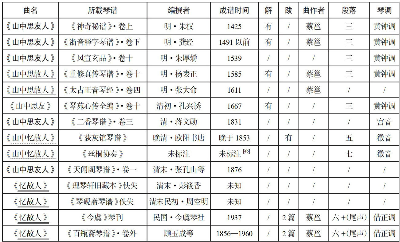 琴曲《忆故人》之谱本源流考