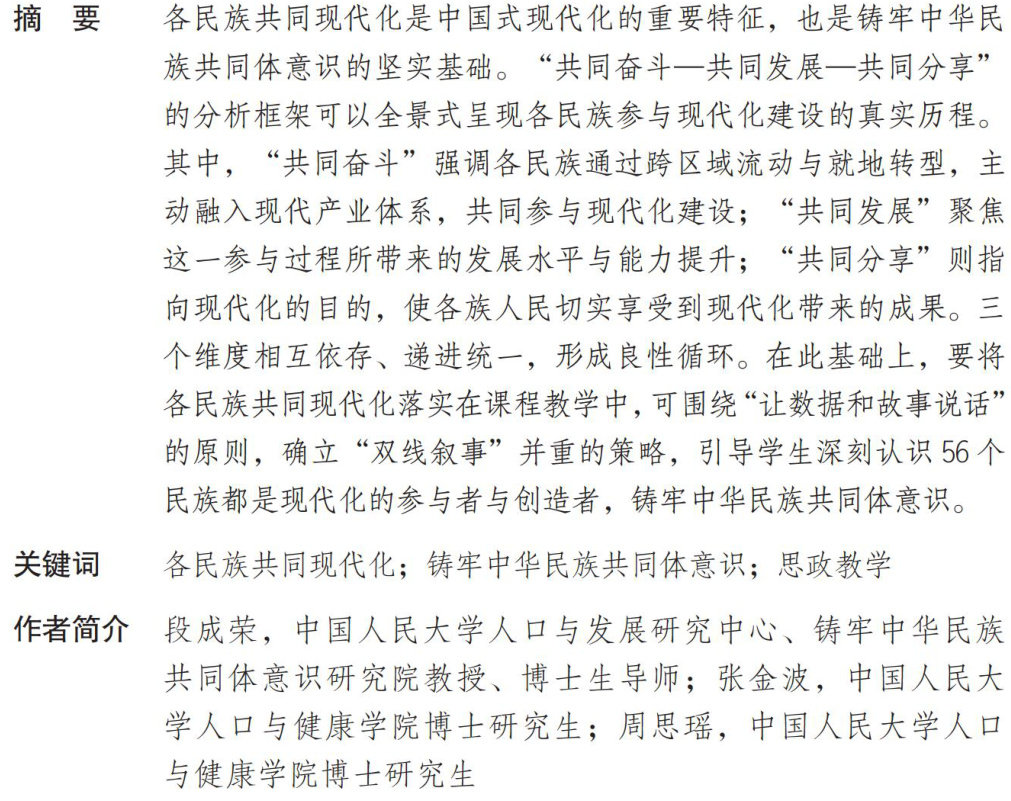 2023年10月27日,习近平总书记在二十届中央政治局第九次集体学习时强调:“全面建成社会主义现代化强国,一个民族也不能少。”这一论述深刻界定了中国式现代化是56个民族作为命运共同体,在交往交流交融中同步并进的宏大历史进程。理解这一进程,对于开展铸牢中华民族共同体意识教育具有重要意义。本文首先回答,为什么要在各民族共同现代化中铸牢中华民族共同体意识;其次,构建“共同奋斗一共同发展一共同分享”的分析框架,以更深入理解各民族共同现代化的内涵与历程;最后,讨论怎样将对各民族共同现代化的理解转化为教学实践,以期为民族团结教育提供新的素材与视角。(剩余6863字)