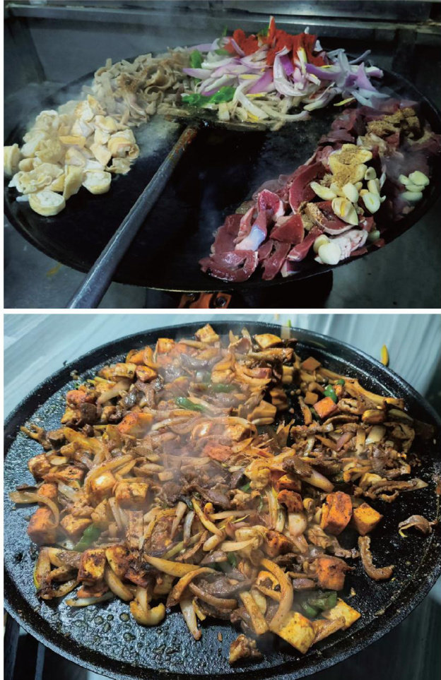 夜色中的张掖甘州市场人声鼎沸,突然,不远处猛然窜起明火,瞬间吸引了我的注意。我走近一看,一群人围在那口直径尺余的圆形铁鏊子旁,听友人说,鏊子上的美食就是当地鼎鼎有名的炒拨拉。