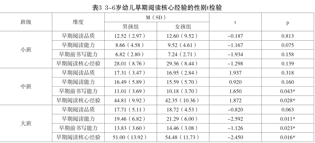 【摘要】本研究采用方便取样法和分层随机抽样法对浙江省和上海市380名幼儿从小班起进行了三年共3次的追踪调查,探究3~6岁幼儿早期阅读核心经验发展的特点、规律和性别差异。结果表明:3~6岁幼儿的早期阅读核心经验是逐步发展的,存在年龄上的阶段性和连续性,大班幼儿高于中班幼儿,中班幼儿高于小班幼儿。小班到中班是幼儿早期阅读品质、早期阅读能力的快速发展阶段,中班到大班是幼儿前书写能力的快速发展阶段。(剩余8000字)