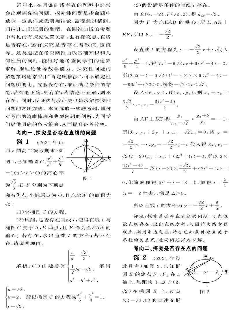 近年来,在圆锥曲线考查的题型中经常会出现探究性问题。探究性问题是指命题中缺少一定条件或无明确结论,需要经过猜测、归纳并加以证明的题型。在圆锥曲线的考题中常见的有探究位置关系,也有探究点、直线是否存在,还有探究是否存在常数值、定值等。这类题型在考查圆锥曲线基础知识和几何性质的同时,能很好地考查同学们的运算求解、推理论证等数学能力。(剩余148字)